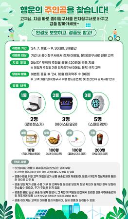 행사 기간 종이청구서에서 전자청구서로 전환 신청한 고객을 대상으로 추첨을 통해 420명에게 로봇청소기, 헤어스타일러, 스마트워치, 국민관광상품권 등 푸짐한 경품을 제공한다.
