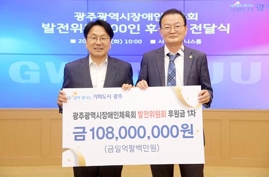 광주시장애인체육회(회장 강기정 광주시장)는 2일 시청 비즈니스룸에서 ‘광주시장애인체육회 발전위원회(추진단장 정선교) 후원금 전달식’을 개최했다.