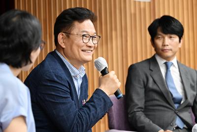 송영길 소나무당 대표가 5일 오후 광주 서구 5·18교육관에서 열린 \'송영길과 함께 찾아가는 길 광주\' 시민 대담회에서 발언하고 있다.