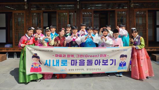 이날 동 주민자치회 위원들이 마을해설사로 나선 가운데 중앙초교 학생들은 한복을 착용한 채 충장동 마을사랑채를 시작으로 금호시민문화관, 도로원표, 도깨비 골목 등을 순회하는 시간을 가졌다.
