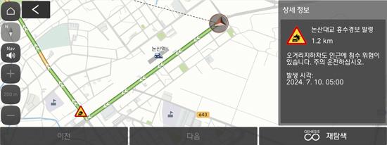 이제 여름 장마 기간 실시간 홍수 경보를 내비게이션을 통해 확인하고 더욱 안전하게 주행할 수 있다.