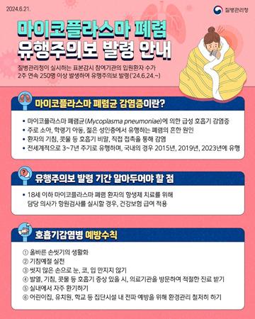 질병관리청에서는 주간 입원환자가 250명 이상인 상태가 2주간 지속됨에 따라 지난 6월 24일 유행주의보를 발령하고, 18세 이하 소아청소년 대상 마이코플라스마 항원검사에 대한 건강보험 급여 적용을 시행했다.