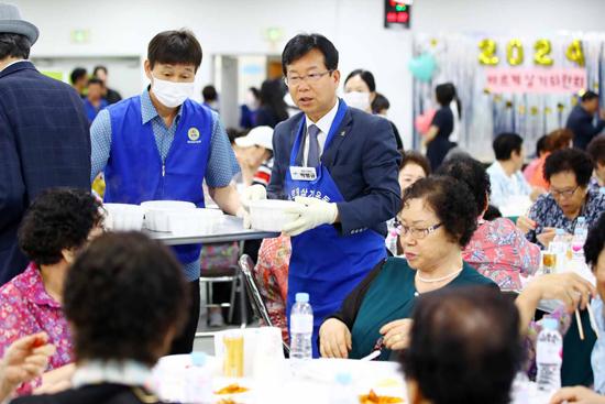 박병규 광산구청장이 12일 초복을 앞두고 지역 어르신들의 건강을 응원하며 건강 삼계탕 배식 봉사를 펼쳤다.