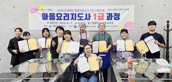 자격증을 취득한 이들은 동구평생학습관에서 운영 중인 아동요리지도사 1급 과정에 참여 중인 10명의 청각·시각·뇌병변 등 장애인 대학생 중 9명이다.