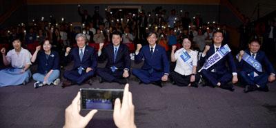 지난 13일 오후 광주 남구 광주음악산업진흥센터 피크뮤직홀에서 열린 조국혁신당 당대표·최고위원 후보자 순회간담회(광주)에서 후보들이 기념사진을 찍고 있다.