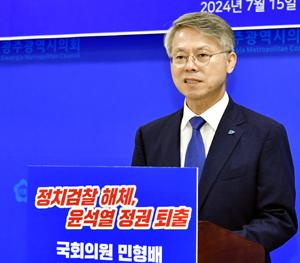 민주당 전당대회 최고위원 본선거에 진출한 민 의원은 15일 오전 광주시의회에서 최고위원 출마보고 기자회견을 갖고 \"정치검찰 해체, 윤석열 정권 퇴출에 민형배가 광주답게 당당하게 앞장서겠다\"고 밝혔다.