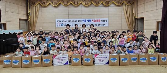이날 전달식은 율산유치원 체육관에서 진행됐으며 ‘순천 율산 밤톨이 나눔 장터’ 판매 수익금으로 마련된 뜻깊은 자리였다. 또한 아이들이 쓴 손편지와 함께 전달된 이번 후원물품은 독거노인 및 청장년 1인가구 등 14세대에게 전달됐다.