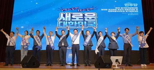 김지수(왼쪽 다섯 번째부터), 김두관, 이재명 더불어민주당 당 대표 후보와 최고위원 후보들이 21일 오전 강원 홍천군 홍천종합체육관에서 열린 제1차 정기전국당원대회 당 대표 및 최고위원 후보자 합동연설회에서 기념촬영을 하고 있다.