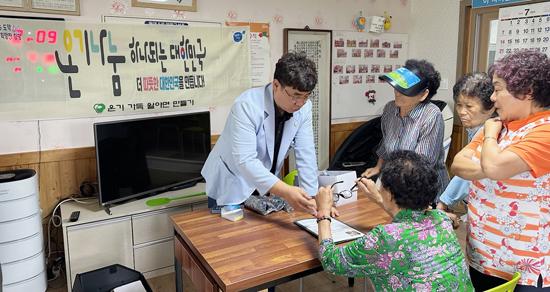 함평군 월야면이 매월 마을 경로당을 순회하며 어르신의 시력검사와 함께 맞춤형 돋보기안경을 지원한다.