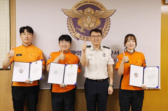 광주 서부소방서는 자서 소속 구급대원 전해동·강다연·정성진 소방장이 광주소방안전본부로부터 금색 하트 세이버(Heart Saver) 배지를 수여받았다고 22일 밝혔다. /광주 서부소방서 제공