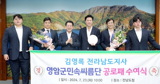 김영록 전남도지사는 23일 오전 도청 접견실에서 영암군민속씨름단에 전남 우수 농수산물 홍보에 대한 감사의 뜻으로 공로패를 수여했다.