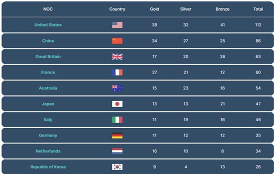 중국이 34개의 금메달을 얻고, 개최국 프랑스가 27개의 금메달을 획득해 금메달 기준 2, 3위를 차지할 것으로 예상했다.