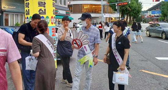 이번 캠페인은 길거리 흡연 민원 발생이 많은 동명동 골목 일대에서 유동인구가 많은 저녁시간에 진행됐으며 금연지도원과 보건소가 함께 참여했다.