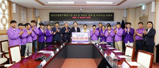 신안군정원수사회적협동조합 지도읍 작목반 임원과 조합원들은 지난 20일 신안군청을 방문해 (재)신안군장학재단과 (재)신안군복지재단에 각각 장학 및 복지 기금 5000만 원 기탁을 약정하고 1000만 원씩 전달했다.