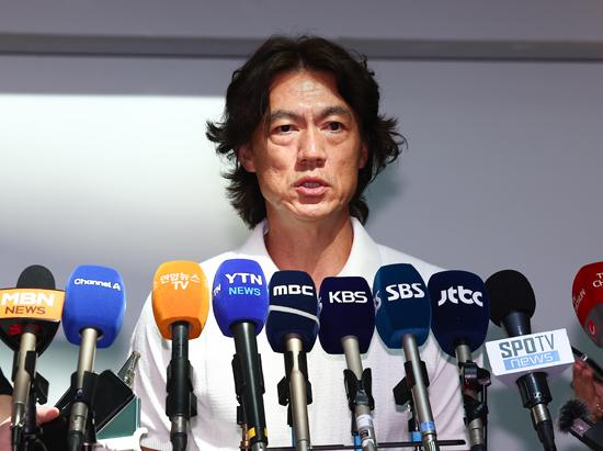 홍명보 신임 대한민국 축구국가대표팀 감독이 지난 15일 오전 인천 중구 인천국제공항 제1여객터미널에서 외국인 국가대표 코칭스태프 선임 관련 업무차 출국 전 취재진 질문에 답하고 있다. 2024.07.15.