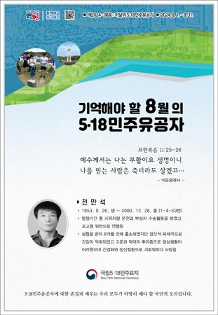 국립5·18민주묘지관리사무소는 8월의 5·18민주유공자로 고(故) 전만식씨를 선정했다고 2일 밝혔다.
