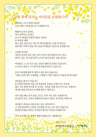 이 교육감은 서한문에서 \"자랑스러운 광주 수험생들, 그대들이 어떤 사람인지 마음껏 보여주라\"며 \"여러분 곁에는 부모님·친구들·선생님들·광주교육가족 모두가 한마음으로 함께하고 있으니 수능시험이 끝나는 순간까지 최선을 다해 주기 바란다\"고 말했다. 이어 \"한걸음 한걸음 내딛는 수험생의 빛나는 하루를 응원한다\"고 덧붙였다.