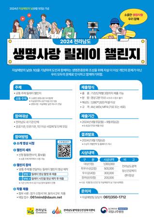 전남도가 자살 예방과 생명 존중을 위한 사회적 공감대 형성을 위해 2024년 생명사랑 릴레이 챌린지 대회를 진행한다.