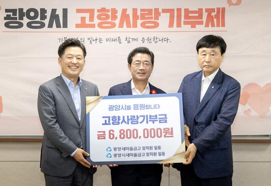 광양시는 광양새마을금고와 광양시새마을금고 임직원 68명이 고향사랑기부제 활성화와 기부문화 확산을 위해 상호기부에 동참해 고향사랑기부금 680만 원을 전달했다고 12일 밝혔다.