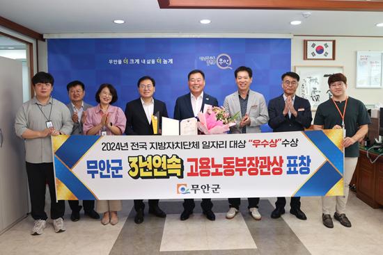 무안군이 고용노동부 주관 ‘2024년 전국 지방자치단체 일자리대상 시상식’에서 일자리 공시제 부문에서 3년 연속 우수 자치단체 표창의 성과를 거뒀다고 13일 밝혔다.