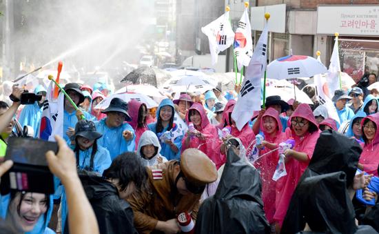 행진을 마친 참가자들은 홍범도 장군 흉상이 설치된 공원에 모여 태극기를 연신 흔들었다. 다같이 물총을 쏴 터뜨린 박에서는 \'영웅을 기억하는 나라\', \'대한 독립 만세\' 등이 적힌 대형 현수막이 펼쳐졌다