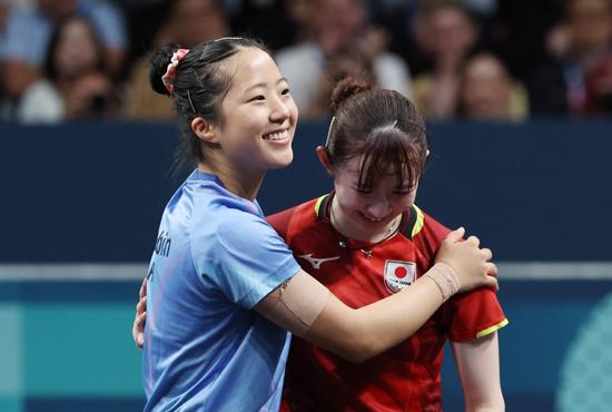 신유빈이 3일(현지시각) 프랑스 파리 사우스 파리 아레나4에서 열린 2024 파리 올림픽 탁구 여자 단식 동메달 결정전에서 패한 뒤 상대 선수 일본 하야타 히나와 포옹하고 있다. 2024.08.03.
