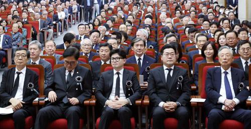 우원식 국회의장과 한동훈 국민의힘 대표, 박찬대 더불어민주당 당 대표 직무대행 겸 원내대표 등 여야 대표가 18일 오전 서울 동작구 국립서울현충원 현충관에서 열린 \'김대중 전 대통령 서거 15주기 추도식\'에 참석해 있다.
