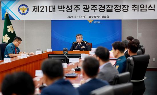 박성주(58) 신임 광주경찰청장은 16일 취임사에서 \"지역 실정에 맞는 경찰 활동으로 시민 불안감 해소에 최선을 다할 것이다\"며 각오를 드러냈다.