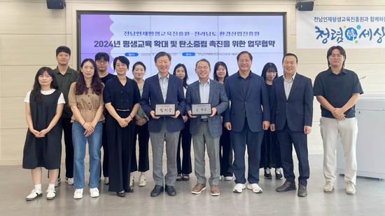 전남도인재평생교육진흥원은 26일 전남도환경산업진흥원과 함께 ‘전남의 평생교육 확대 및 탄소중립 촉진’을 위한 업무협약을 했다.