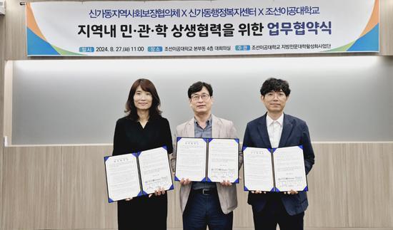 신가동은 27일 조선이공대학교에서 협약식을 갖고 조선이공대학교, 신가동 지역사회보장협의체(이하 지사협)와 주민 복지증진을 위한 상호협력을 다짐하는 업무협약을 체결했다.