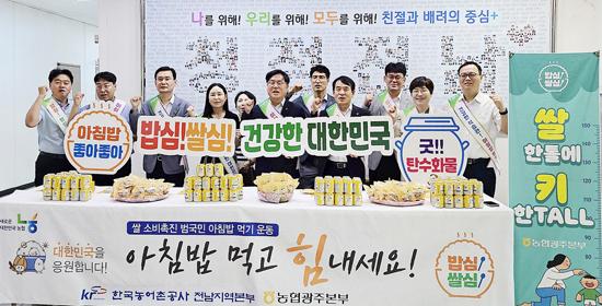 농어촌공사 전남본부는 27일 본부 1층 로비에서 농협중앙회 광주지역본부와 함께 출근하는 직원들을 대상으로 \'아침밥 먹기 캠페인\'을 진행하고 \'쌀 소비 촉진\'을 위한 업무협약을 체결했다.