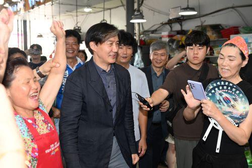 의원 워크숍 참석을 위해 영광을 찾은 조국혁신당 조국 대표가 29일 영광터미널시장을 방문해 지역 주민과 상인들에게 지지를 호소하며 인사를 나누고 있다.