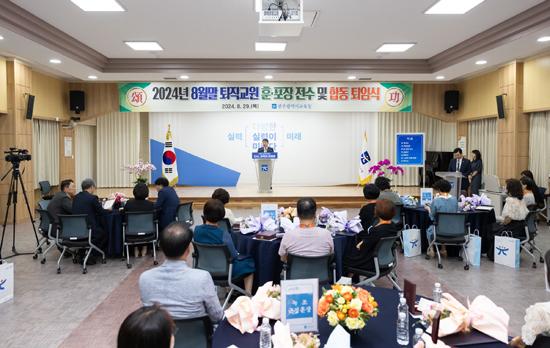 광주시교육청은 29일 대회의실에서 8월 말 정년퇴직과 2월 명예퇴직 교원 등을 대상으로 ‘퇴직교원 훈·포장 전수 및 합동 퇴임식’을 개최했다.