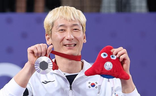 2024 파리 패럴림픽 배드민턴 남자 단식(스포츠 등급 WH1)에서 은메달을 딴 최정만이 2일(현지시각) 프랑스 파리 포르트드라샤펠 경기장에서 열린 시상식에서 은메달을 들어올려 보이고 있다. (사진=대한장애인체육회 제공) 2024.09.03.