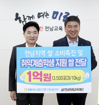 이날 쌀 기탁은 NH농협은행 전남본부가 전남에 재학 중인 취약계층 학생을 지원하고, 전남지역의 쌀 소비를 촉진하기 위한 것이다.