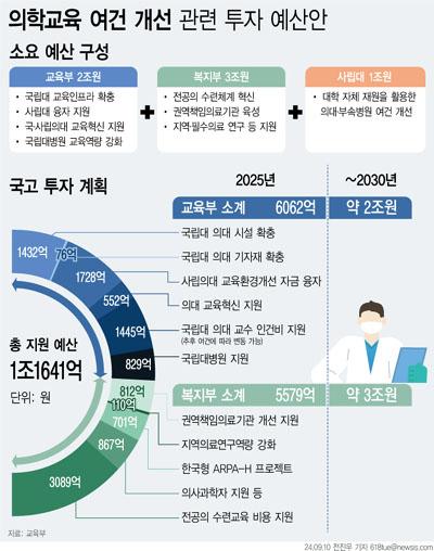 2025년도 교육부 예산안에 따르면 국립대 의대 시설과 기자재 확충에 1508억원, 사립의대 교육환경개선 자금 융자(1728억원) 등 교육 기반 시설 구축에만 3236억원이 투입된다.
