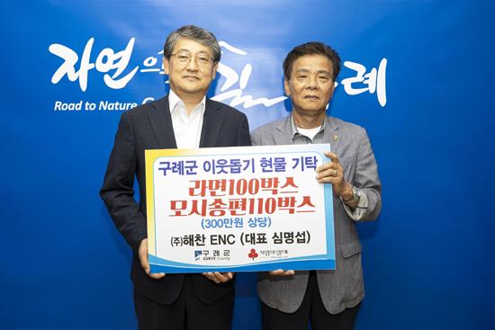 구례군은 지난 10일 ㈜해찬ENC에서 추석 명절을 맞아 복지 사각지대 등 어려운 이웃을 위해 나눔 물품을 기탁했다고 밝혔다.