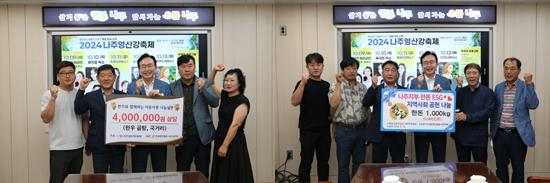전국한우협회 나주시지부는 400만원 상당의 한우 곰탕 88세트를, 대한한돈협회 나주시지부는 1100만원 상당의 한돈 500박스를 기탁했다. 후원 물품은 지역 내 취약계층 및 다둥이 가정에 전달될 예정이다.