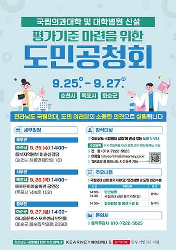 먼저, 순천시에서 열릴 동부권 공청회는 오는 25일(수) 전라남도 동부지역본부 이순신강당에서 개최되고, 서부권인 목포시에서는 다음날인 26일(목) 목포문화예술회관 공연장(갓바위)에서 열린다. 마지막 날인 27일(금)에는 화순군 하니움문화스포츠센터 만연홀에서 개최된다.