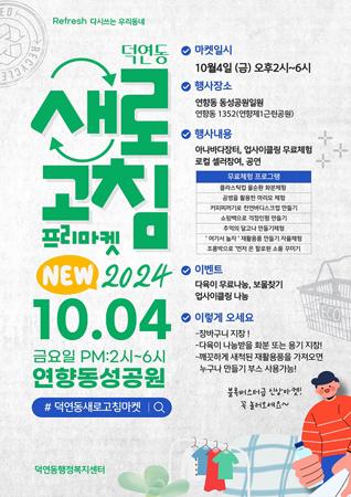 순천시 덕연동은 오는 10월 4일 연향제1근린공원(연향동성공원)에서 ‘새로고침 프리마켓’을 개최한다고 밝혔다.