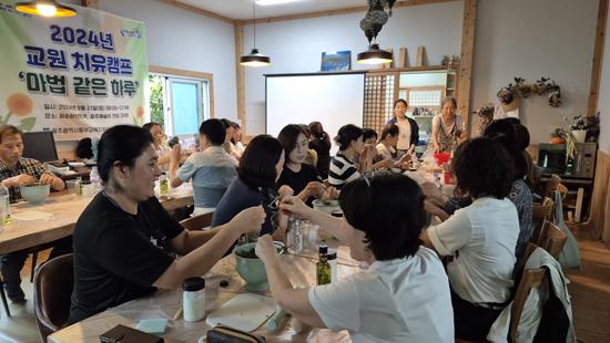 교원들은 오전에 전남 화순군의 허브 정원에서 정원길을 걸으며 스트레스를 해소했다. 또 허브오일 및 허브솔트 만들기 체험활동을 참여하며 소통과 공감의 시간을 가졌다.