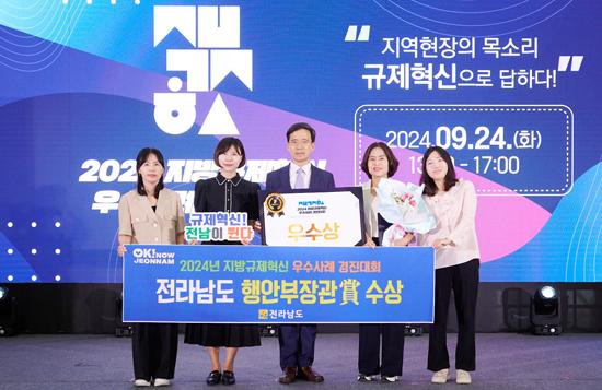 전남도가 대구 엑스포(EXCO)에서 열린 행정안전부의 2024년 지방규제혁신 우수사례 경진대회에서 우수상(행안부장관상)을 수상했다.