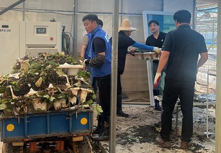 21일 집중호우에 0.3㏊ 딸기재배 시설하우스의 침수 피해를 입은 곳에서 일손돕기에 나선 이들은, 화분 제거 작업 등을 실시하며 농가의 시름을 달랬다.