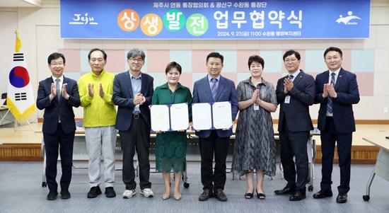광주 광산구 수완동 통장단이 지난 27일 수완동 행정복지센터에서 제주 연동 통장협의회와 상생발전을 도모하고 고향사랑기부제 활성화를 위한 업무협약을 체결했다.