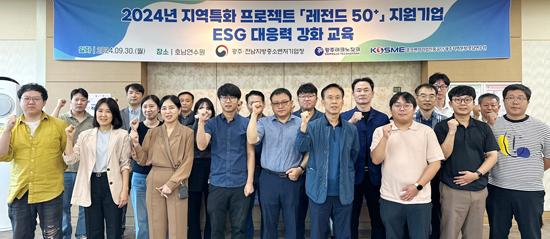 광주전남지방중소벤처기업청은 지난달 30일 중소벤처기업진흥공단 호남연수원에서 광주테크노파크, 중소벤처기업진흥공단과 함께 지역특화 프로젝트 \'레전드 50+\' 참여기업을 대상으로 맞춤형 ESG 프로그램을 지원했다고 밝혔다.