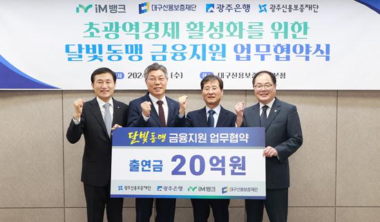 광주은행은 지난 2일 대구신용보증재단 본점에서 광주신용보증재단, iM뱅크, 대구신용보증재단과 \'초광역경제 활성화를 위한 달빛동맹 금융지원 업무협약\'을 체결했다고 4일 밝혔다.