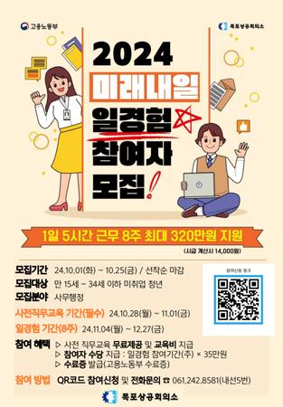 목포상공회의소는 고용노동부에서 주관하는 2024년도 미래내일일경험 지원사업에 공모해 지난 9월 9일 운영기관에 선정되어 제1기 모집을 초과달성했으며 ‘2024년 미래내일일경험 지원사업’ 제2기 참여자를 10월 1일부터 10월 25일까지 모집한다고 밝혔다.
