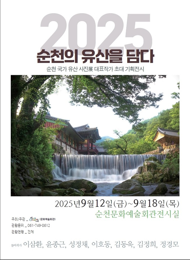 순천시문화예술회관은 오는 12일부터 18일까지 문화예술회관 전시실에서 기획전시 「순천의 유산을 담다: 순천 국가유산 사진展」을 개최한다고 밝혔다.