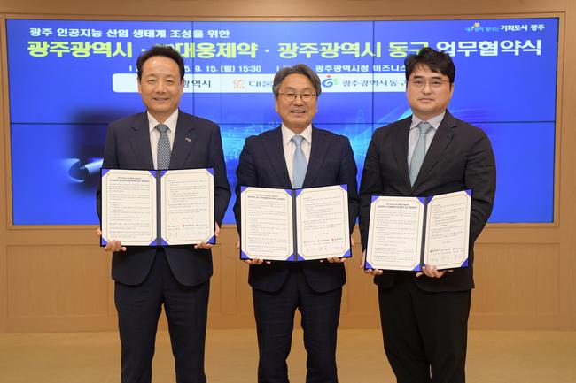 광주광역시는 시청 비즈니스룸에서 ㈜대웅제약, 광주 동구와 함께 ‘광주시 인공지능산업 생태계 조성을 위한 업무협약’을 체결했다고 밝혔다.