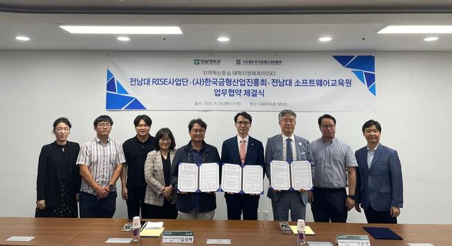 전남대에 따르면 전남대학교 RISE사업단은 (사)한국금형산업진흥회, 전남대학교 소프트웨어교육원과 함께 지역혁신중심 대학지원체계(RISE)를 기반으로 한 업무협약(MOU)을 지난 16일 체결했다.
